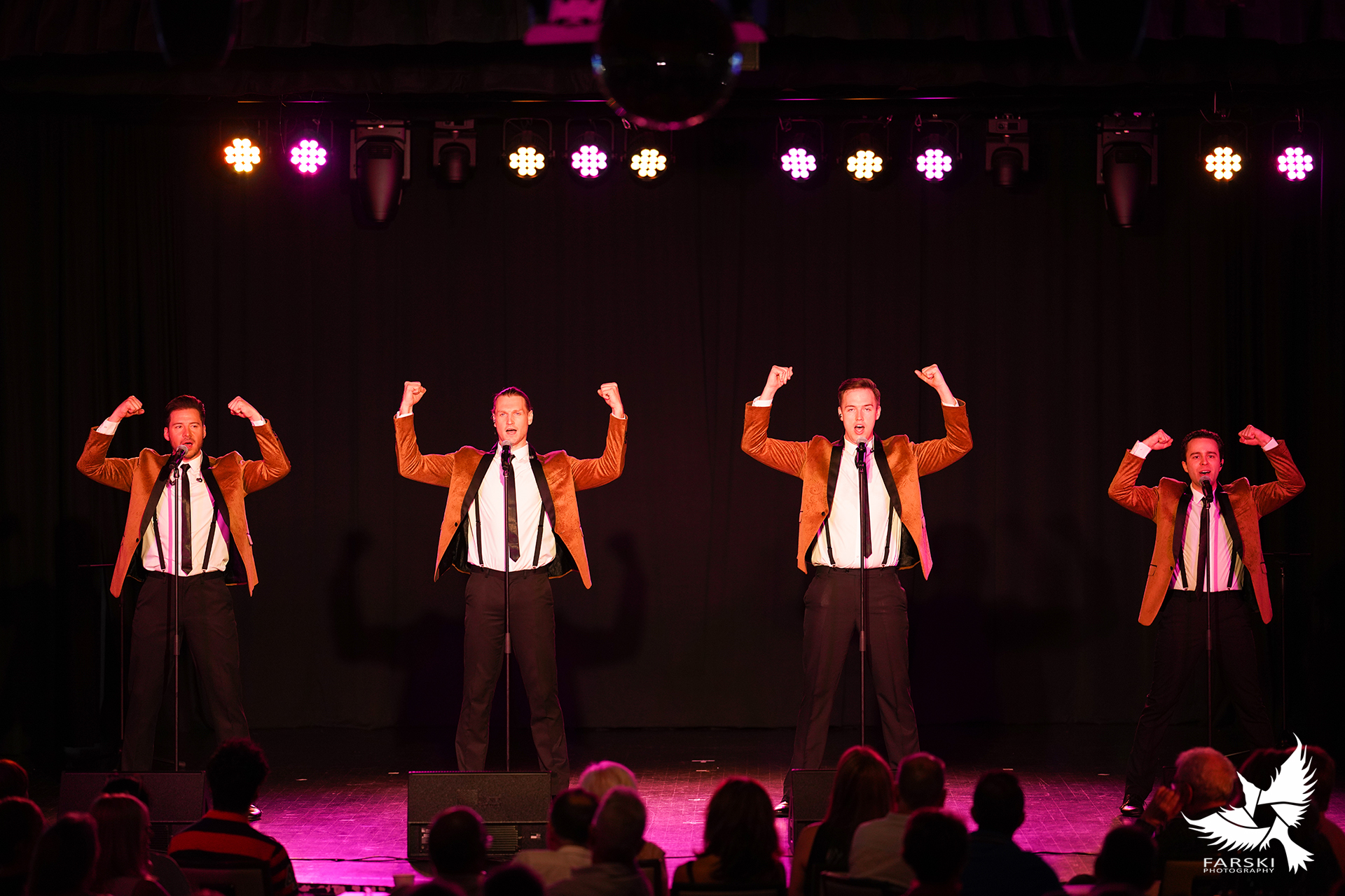 This incredible show is scaleable from its simplest form of just the four guys to the full spectacle of the four guys with five female backing dancers/singers and 12-piece show band. The length and format of the show can be tailored suite your event from a 20 minute pop-up with the biggest and best hits such as Sherry, Decemebr 63, Big Girls Don?t Cry and Walk Like a Man, to the full 90 minutes including more of the Four Seasons back catalogue and timeless classics from other rock, pop and doowop chart topping groups of the era.